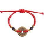 This red string bracelet features the five emperor coins. a feng shui symbol for attracting money luck.