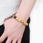 The ??Gold-Plated Double Pixiu Bracelet?? is a charm used in feng shui to invite money energy. Featuring a pair of Pixiu amulets. this bracelet is said to double your riches while safeguarding your entire wealth. This bracelet is commonly used by gamblers to increase their luck.