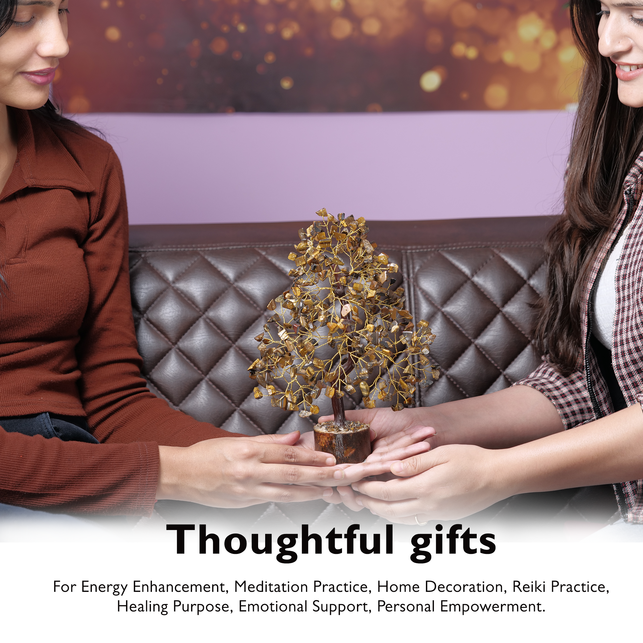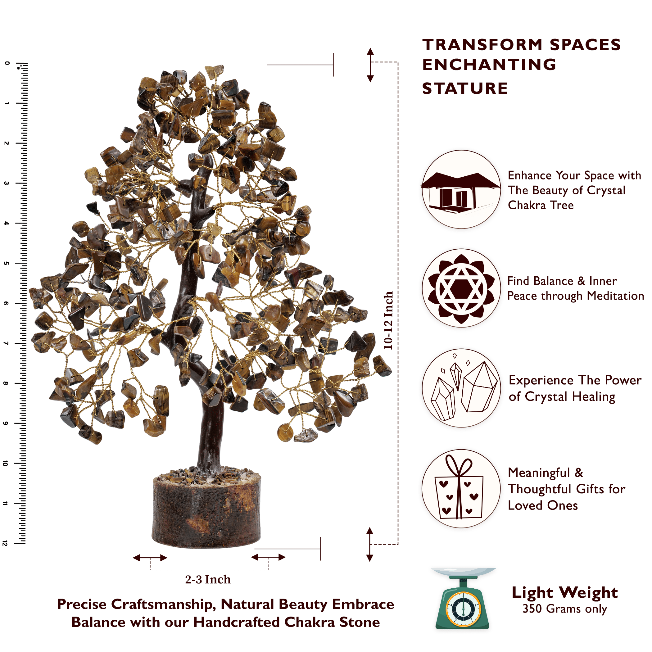 Mesmerizing Design: Delicately sculpted to mimic the organic grace of a tree Size: 10-12 Inch. our crystal tree showcases a symphony of intricate branches adorned with lustrous Tiger Eye gemstones. each reflecting the light with a captivating allure.